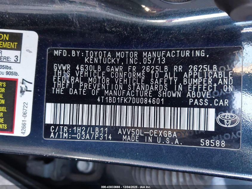 2013 TOYOTA CAMRY HYBRID 2013 року Гибрид, 2.5, Передний привод, vin - 4T1BD1FK7DU084601 из США