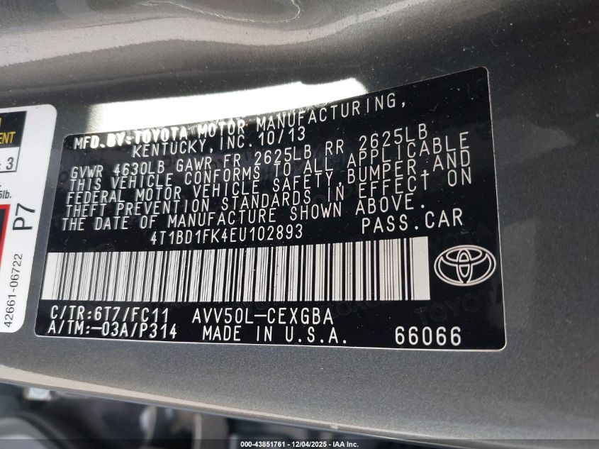 2014 TOYOTA CAMRY HYBRID 2014 року Гибрид, 2.5, Передний привод, vin - 4T1BD1FK4EU102893 из США
