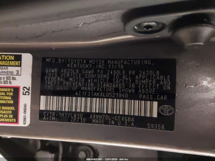 2020 TOYOTA CAMRY HYBRID 2020 року Гибрид, 2.5, Передний привод, vin - 4T1F31AKXLU521940 из США