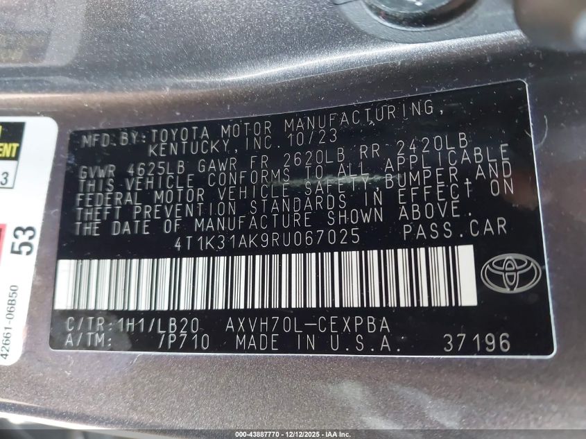 2024 TOYOTA CAMRY HYBRID 2024 року Гибрид, 2.5, Передний привод, vin - 4T1K31AK9RU067025 из США