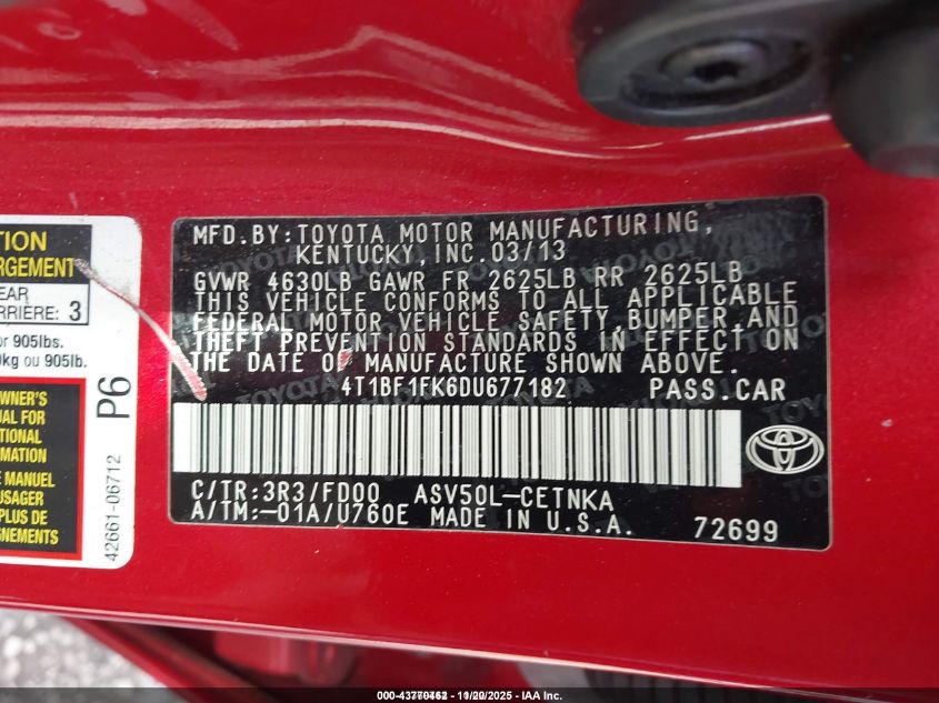 2013 TOYOTA CAMRY 2013 року Бензин, 2.5, Передний привод, vin - 4T1BF1FK6DU677182 из США