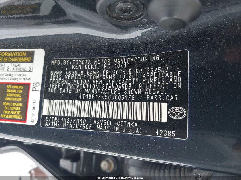 2012 TOYOTA CAMRY 2012 року Бензин, 2.5, Передний привод, vin - 4T1BF1FK5CU006178 из США