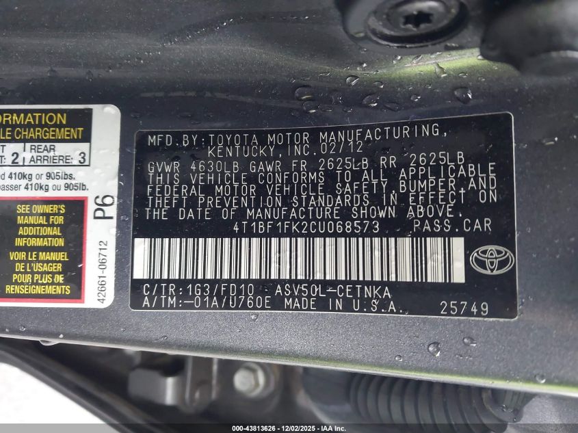 2012 TOYOTA CAMRY 2012 року Бензин, 2.5, Передний привод, vin - 4T1BF1FK2CU068573 из США