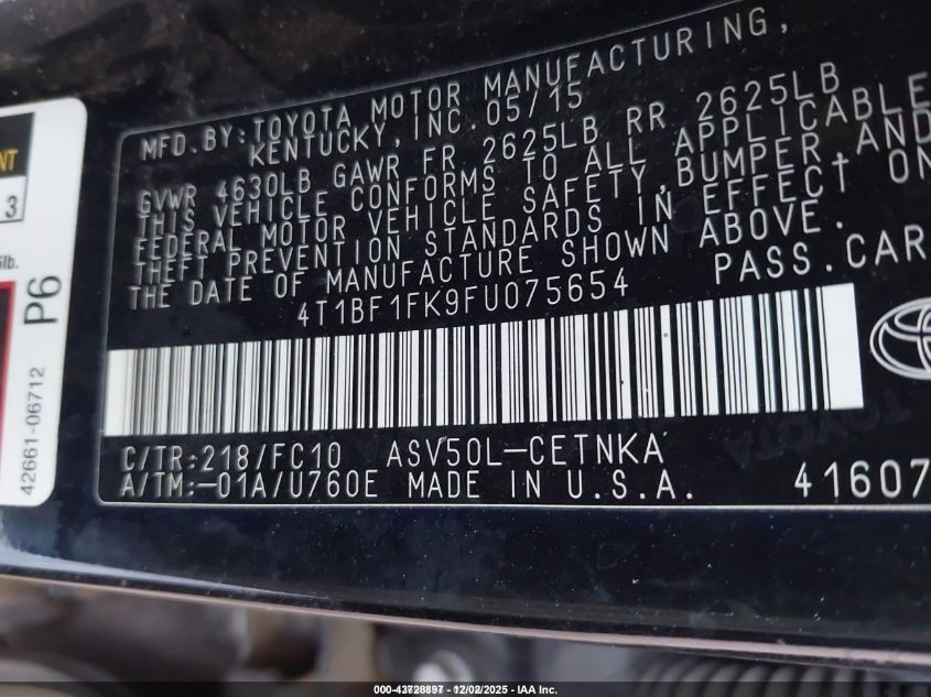 2015 TOYOTA CAMRY 2015 року Бензин, 2.5, Передний привод, vin - 4T1BF1FK9FU075654 из США