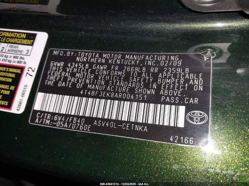 Цвет ЗеленыйЦилиндры 4Привод Передний приводVIN 4T4BF3EK8AR004151Состояние Заводится и едет (проверено)Повреждения Передняя или задняя AutoRIA