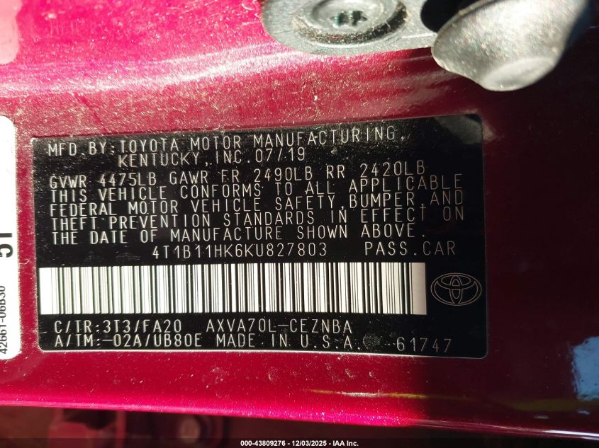 2019 TOYOTA CAMRY 2019 року Бензин, 2.5, Передний привод, vin - 4T1B11HK6KU827803 из США