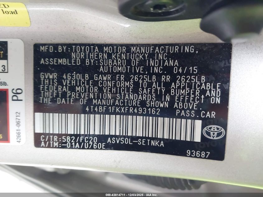 2015 TOYOTA CAMRY 2015 року Бензин, 2.5, Передний привод, vin - 4T4BF1FKXFR493162 из США