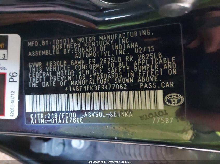 2015 TOYOTA CAMRY 2015 року Бензин, 2.5, Передний привод, vin - 4T4BF1FK3FR477062 из США