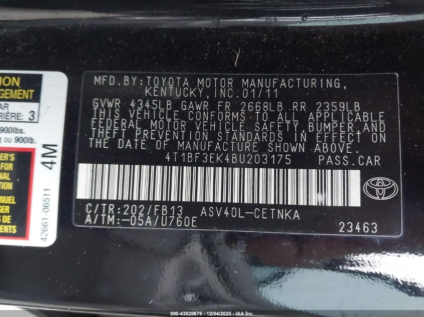 Цвет ЧерныйЦилиндры 4Привод Передний приводVIN 4T1BF3EK4BU203175Состояние СтационарноПовреждения Передняя и задняя AutoRIA