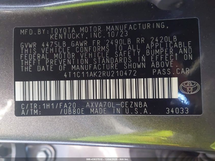 2024 TOYOTA CAMRY 2024 року Бензин, 2.5, Передний привод, vin - 4T1C11AK2RU210472 из США