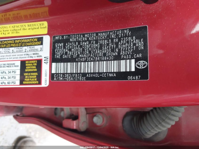 2011 TOYOTA CAMRY 2011 року Бензин, 2.5, Передний привод, vin - 4T4BF3EK7BR168430 из США