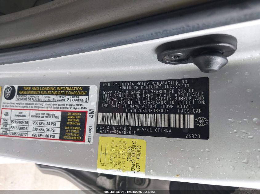 2011 TOYOTA CAMRY 2011 року Бензин, 2.5, Передний привод, vin - 4T4BF3EK5BR187817 из США