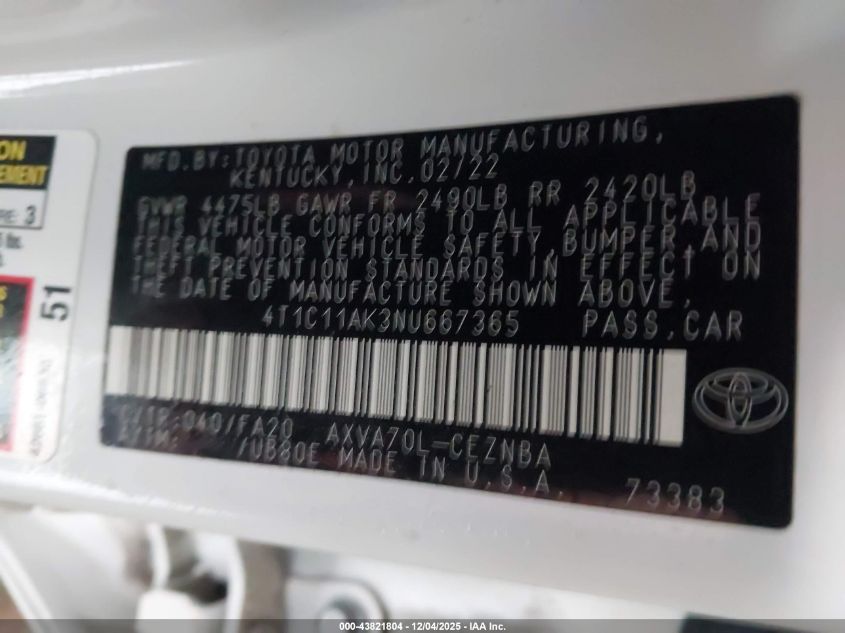 2022 TOYOTA CAMRY 2022 року Бензин, 2.5, Передний привод, vin - 4T1C11AK3NU667365 из США