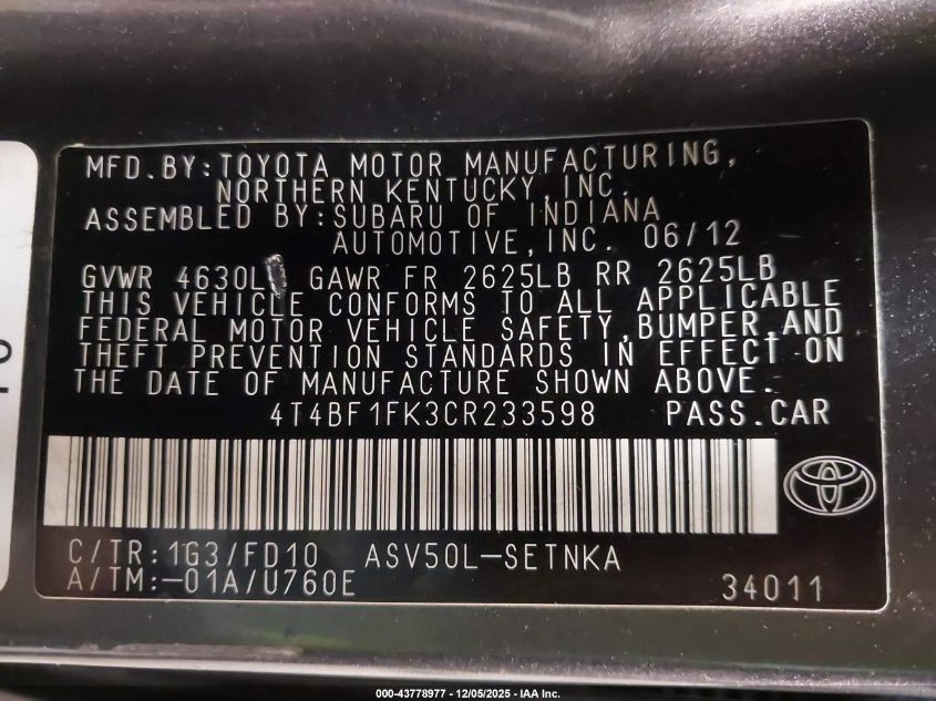 2012 TOYOTA CAMRY 2012 року Бензин, 2.5, Передний привод, vin - 4T4BF1FK3CR233598 из США