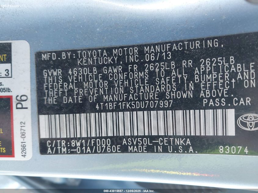 2013 TOYOTA CAMRY 2013 року Бензин, 2.5, Передний привод, vin - 4T1BF1FK5DU707997 из США