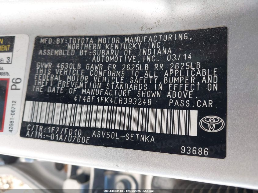2014 TOYOTA CAMRY 2014 року Бензин, 2.5, Передний привод, vin - 4T4BF1FK4ER393248 из США