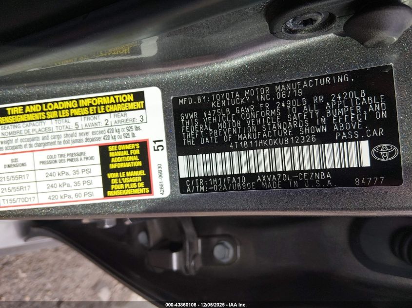 2019 TOYOTA CAMRY 2019 року Бензин, 2.5, Передний привод, vin - 4T1B11HK0KU812326 из США