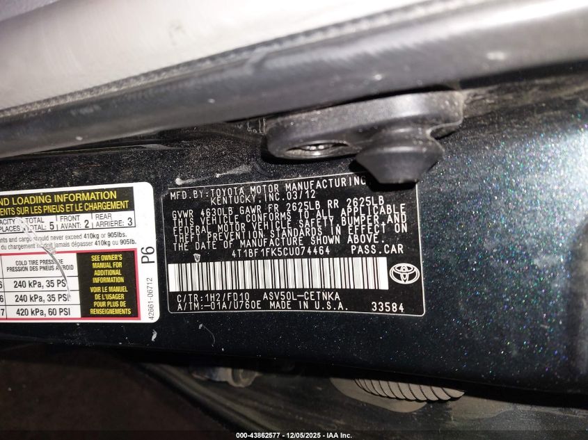 2012 TOYOTA CAMRY 2012 року Бензин, 2.5, Передний привод, vin - 4T1BF1FK5CU074464 из США