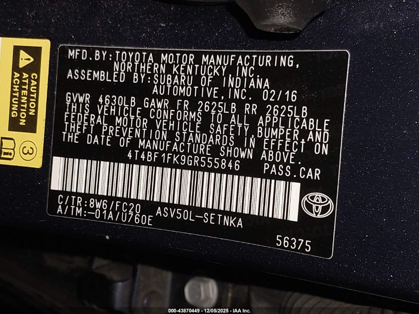 2016 TOYOTA CAMRY 2016 року Бензин, 2.5, Передний привод, vin - 4T4BF1FK9GR555846 из США