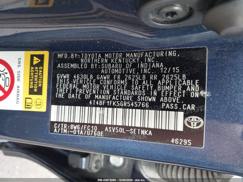 2016 TOYOTA CAMRY 2016 року Бензин, 2.5, Передний привод, vin - 4T4BF1FK5GR545766 из США