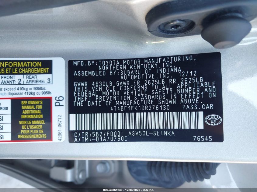 2013 TOYOTA CAMRY 2013 року Бензин, 2.5, Передний привод, vin - 4T4BF1FK1DR276130 из США