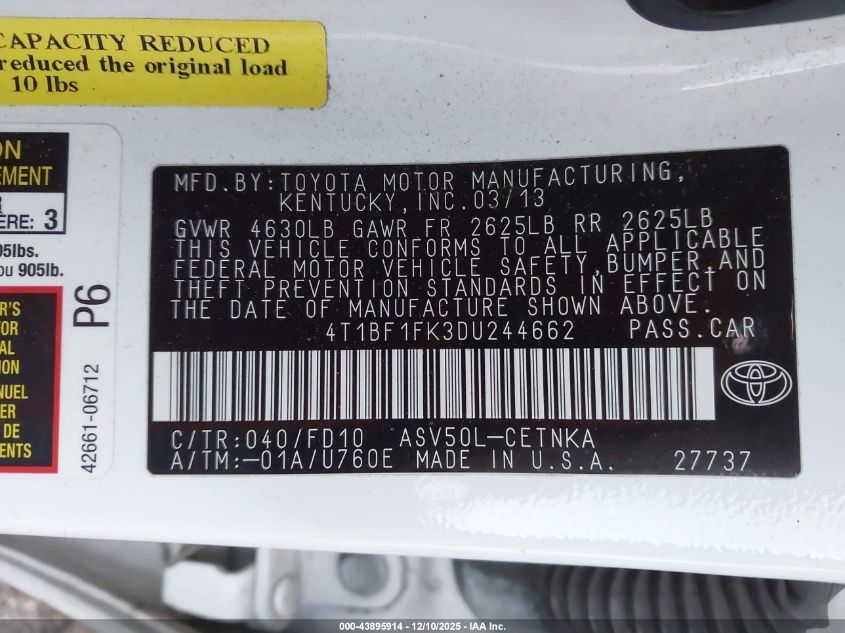 2013 TOYOTA CAMRY 2013 року Бензин, 2.5, Передний привод, vin - 4T1BF1FK3DU244662 из США