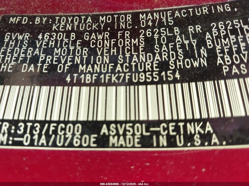 2015 TOYOTA CAMRY 2015 року Бензин, 2.5, Передний привод, vin - 4T1BF1FK7FU955154 из США