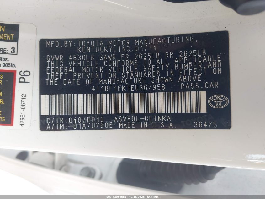 2014 TOYOTA CAMRY 2014 року Бензин, 2.5, Передний привод, vin - 4T1BF1FK1EU367958 из США
