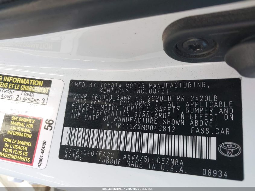 2021 TOYOTA CAMRY 2021 року Бензин, 2.5, Полный привод, vin - 4T1R11BKXMU046812 из США