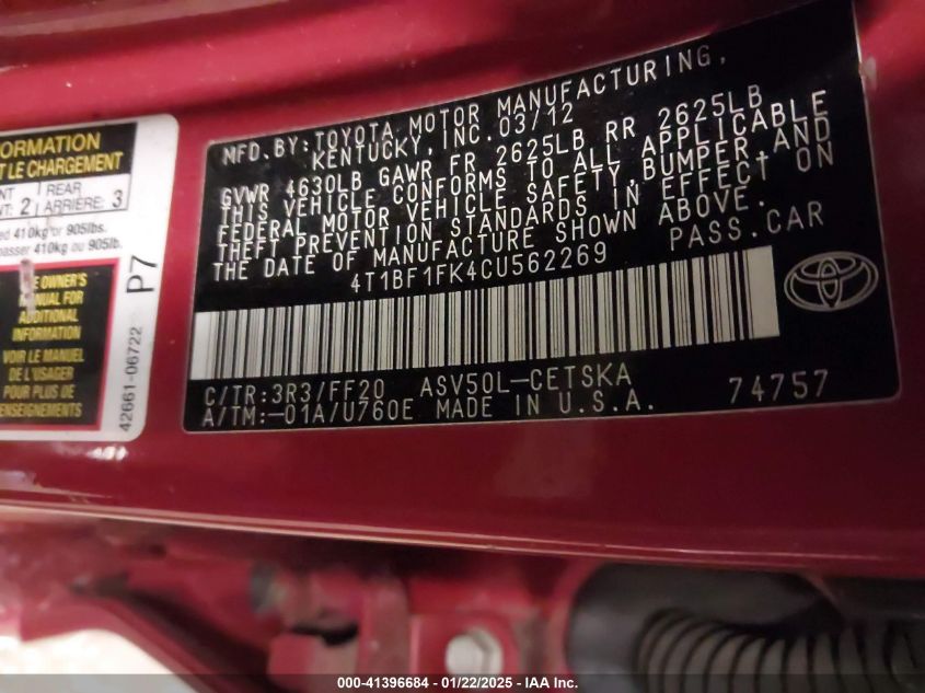 2012 TOYOTA CAMRY 2012 року Бензин, 2.5, Передний привод, vin - 4T1BF1FK4CU562269 из США
