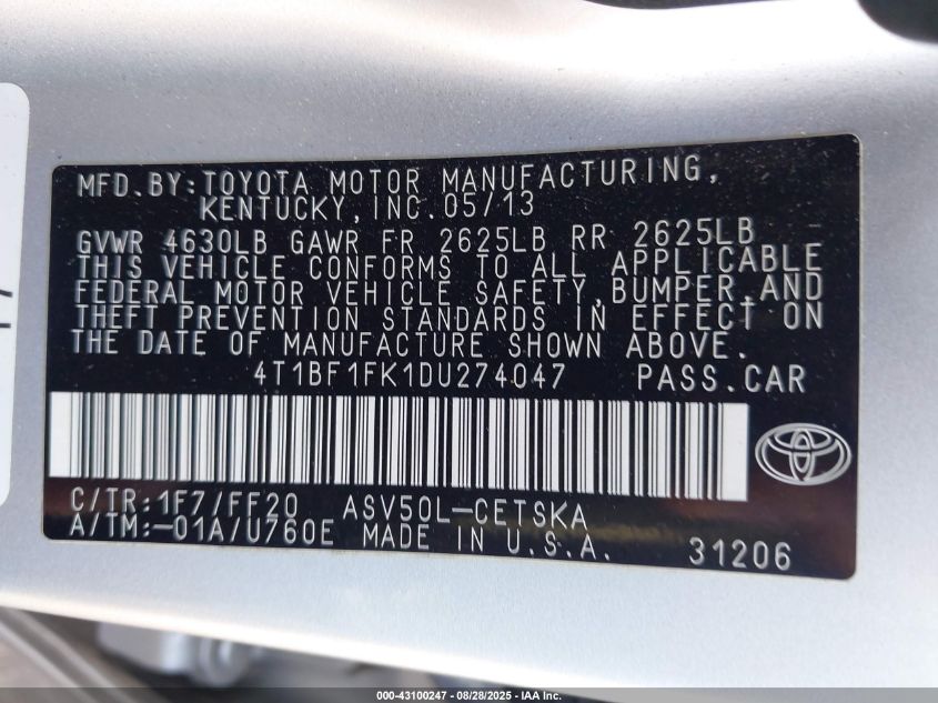 2013 TOYOTA CAMRY 2013 року Бензин, 2.5, Передний привод, vin - 4T1BF1FK1DU274047 из США