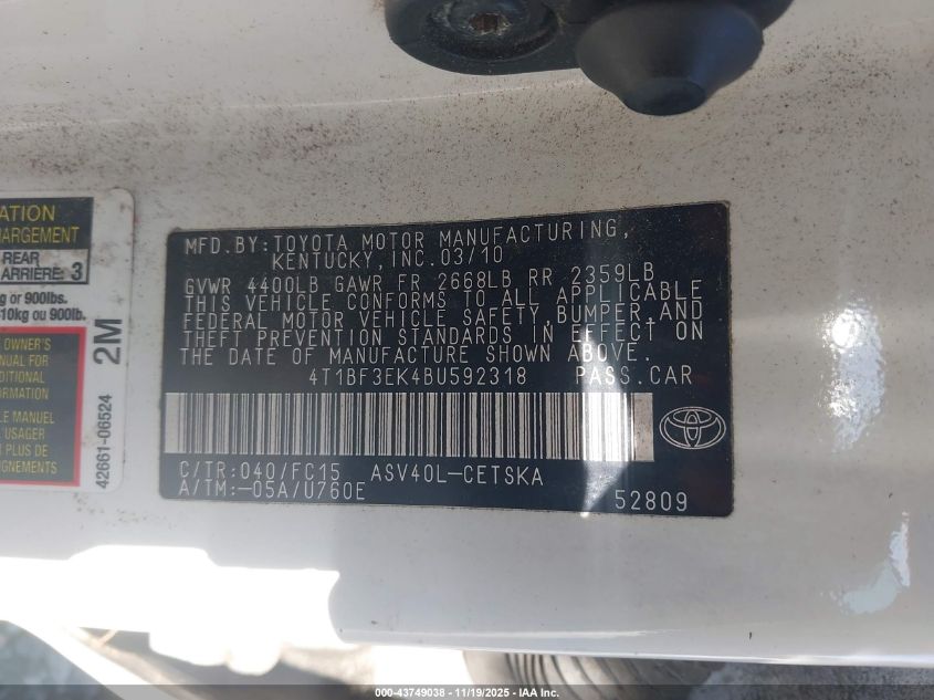 Цвет БелыйЦилиндры 4Привод Передний приводVIN 4T1BF3EK4BU592318Состояние СтационарноПовреждения Передняя праваяДата аукциона 2025-12-08 AutoRIA