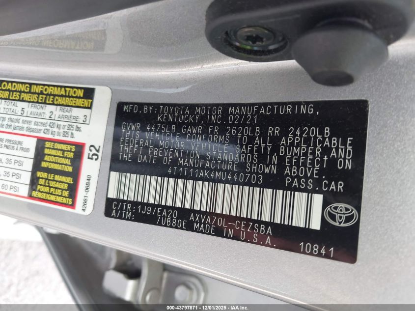 2021 TOYOTA CAMRY 2021 року Бензин, 2.5, Передний привод, vin - 4T1T11AK4MU440703 из США