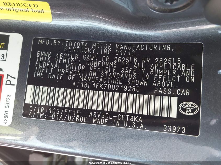 2013 TOYOTA CAMRY 2013 року Бензин, 2.5, Передний привод, vin - 4T1BF1FK7DU219280 из США