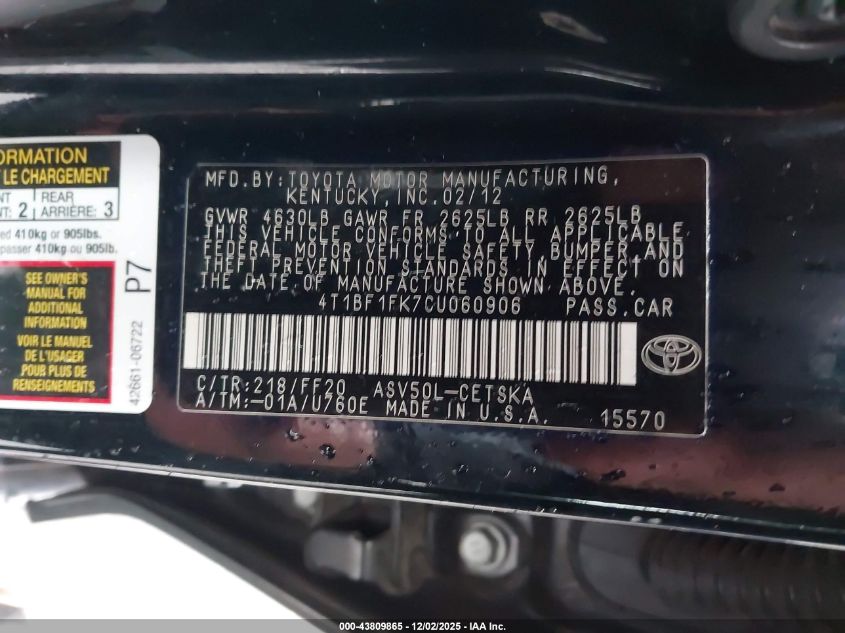 2012 TOYOTA CAMRY 2012 року Бензин, 2.5, Передний привод, vin - 4T1BF1FK7CU060906 из США
