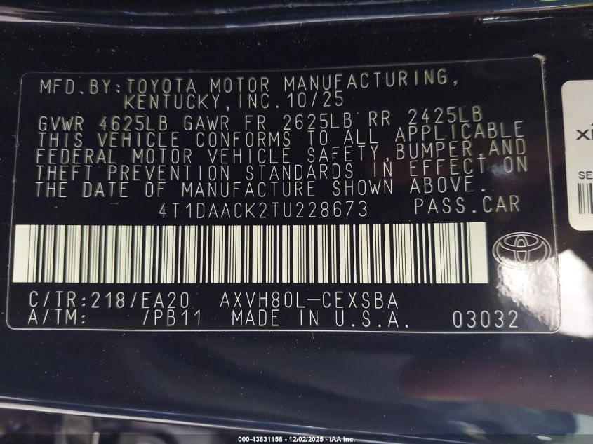 2026 TOYOTA CAMRY 2026 року Гибрид, 2.5, Передний привод, vin - 4T1DAACK2TU228673 из США