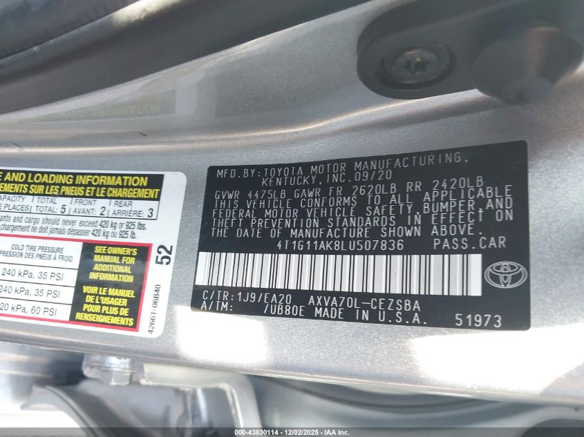 2020 TOYOTA CAMRY 2020 року Бензин, 2.5, Передний привод, vin - 4T1G11AK8LU507836 из США