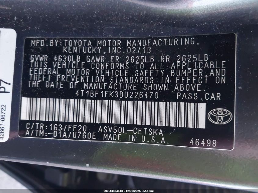 2013 TOYOTA CAMRY 2013 року Бензин, 2.5, Передний привод, vin - 4T1BF1FK3DU226470 из США