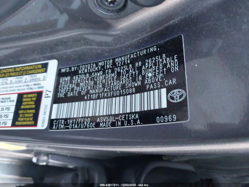 2015 TOYOTA CAMRY 2015 року Бензин, 2.5, Передний привод, vin - 4T1BF1FKXFU015088 из США