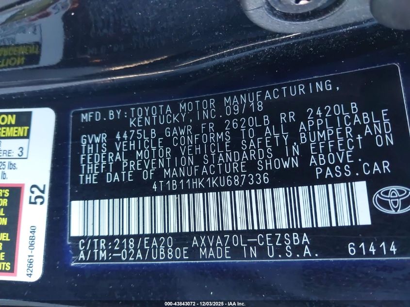 2019 TOYOTA CAMRY 2019 року Бензин, 2.5, Передний привод, vin - 4T1B11HK1KU687336 из США