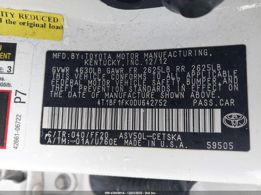 2013 TOYOTA CAMRY 2013 року Бензин, 2.5, Передний привод, vin - 4T1BF1FK0DU642752 из США