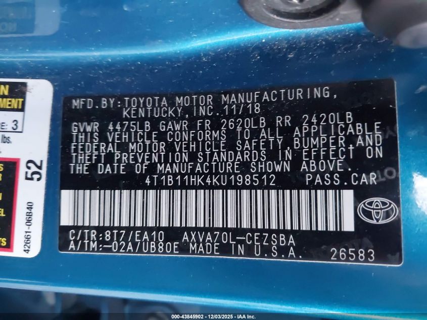 2019 TOYOTA CAMRY 2019 року Бензин, 2.5, Передний привод, vin - 4T1B11HK4KU198512 из США
