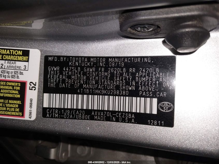 2019 TOYOTA CAMRY 2019 року Бензин, 2.5, Передний привод, vin - 4T1B11HK9KU298380 из США