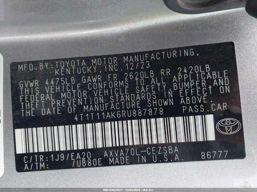 2024 TOYOTA CAMRY 2024 року Бензин, 2.5, Передний привод, vin - 4T1T11AK6RU887878 из США