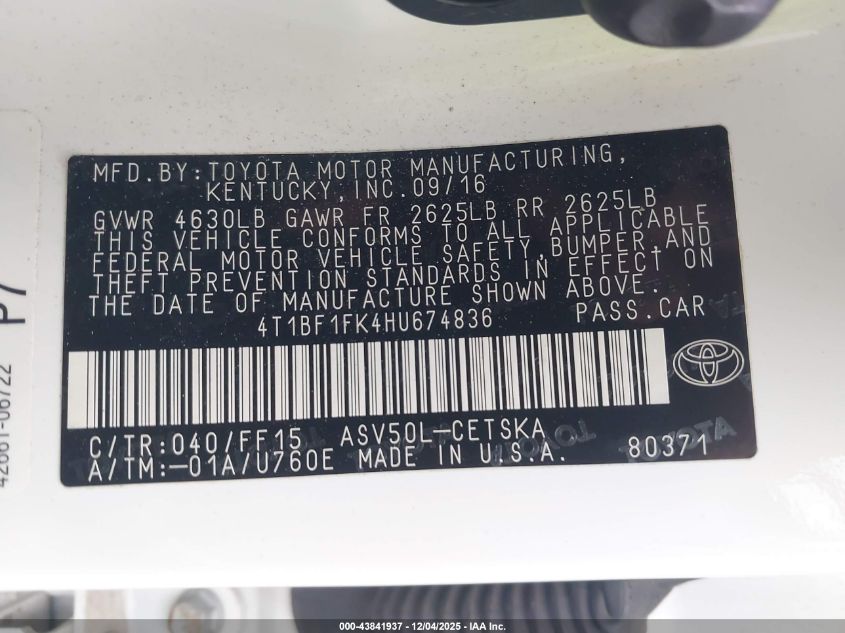 2017 TOYOTA CAMRY 2017 року Бензин, 2.5, Передний привод, vin - 4T1BF1FK4HU674836 из США