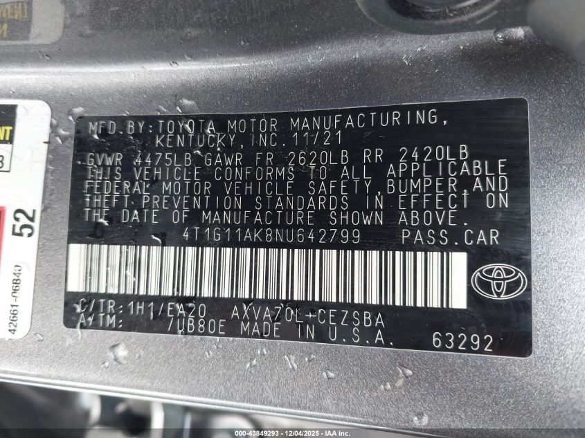 2022 TOYOTA CAMRY 2022 року Бензин, 2.5, Передний привод, vin - 4T1G11AK8NU642799 из США