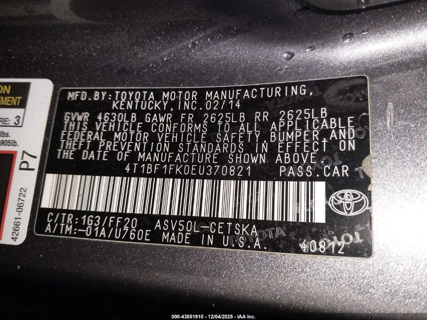 2014 TOYOTA CAMRY 2014 року Бензин, 2.5, Передний привод, vin - 4T1BF1FK0EU370821 из США