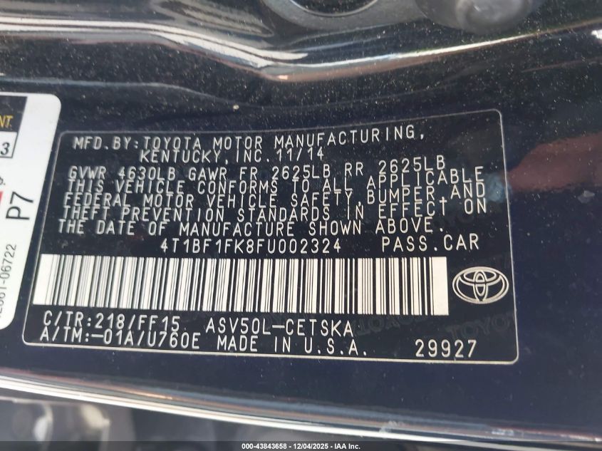 2015 TOYOTA CAMRY 2015 року Бензин, 2.5, Передний привод, vin - 4T1BF1FK8FU002324 из США