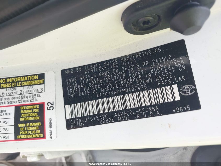 2021 TOYOTA CAMRY 2021 року Бензин, 2.5, Передний привод, vin - 4T1G11AK4MU487425 из США