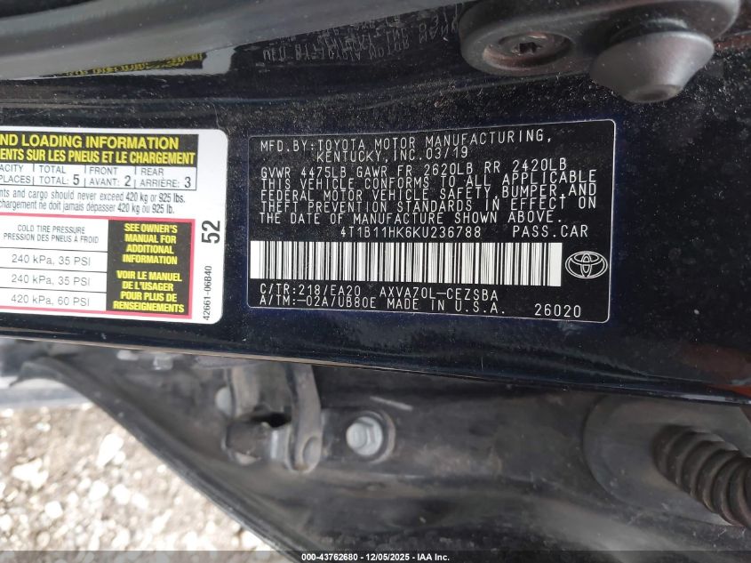 2019 TOYOTA CAMRY 2019 року Бензин, 2.5, Передний привод, vin - 4T1B11HK6KU236788 из США